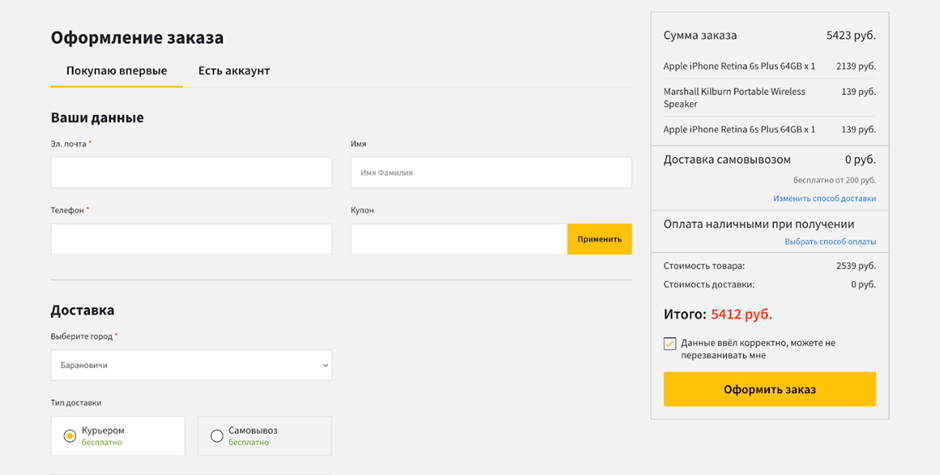 Здесь минимальное количество полей для заполнения и возможность выбирать способ доставки.