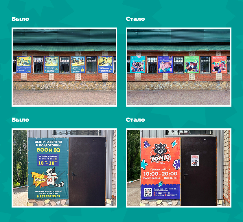 BoomIQ — центр с высоким качеством услуг, но его визуал устарел. Из-за разрозненности материалов и невыразительного фирменного стиля компания проигрывала более современным конкурентам. Главная цель: создать единую дизайн-систему, готовую к масштабированию на новые филиалы.