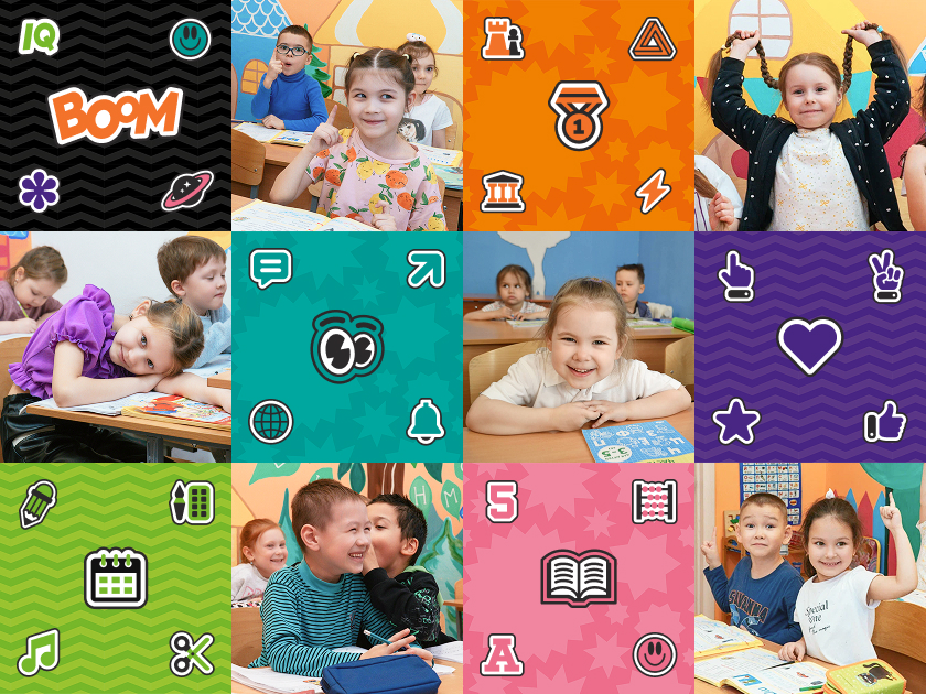 Главная идея графики — это визуализация «бума», энергии и взрыва знаний. Эта энергия наполнила айдентику динамикой, превратив её в удобный конструктор. Бренд получил набор инструментов, с которым легко работать на любых носителях, сохраняя яркость и узнаваемый «нескучный» характер.
