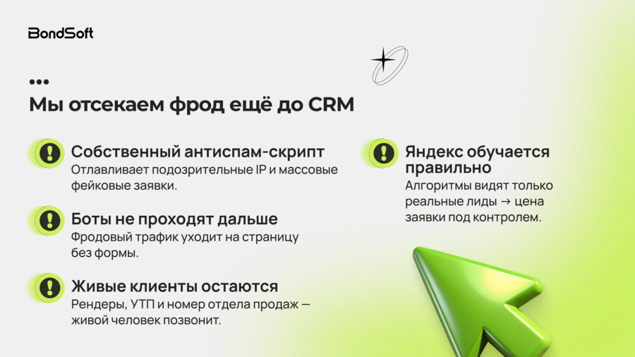 Это позволило отсеять нецелевые обращения ещё на входе и не допустить обучения алгоритмов на фродовых лидах. В первый месяц работы около 90% заявок оказались целевыми.