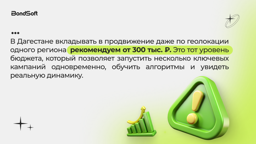 Для рынка Дагестана рекомендуемый бюджет на региональное продвижение составляет около 300 тыс. рублей в месяц. Такой уровень позволяет запускать несколько типов кампаний, собирать статистику и управлять эффективностью.