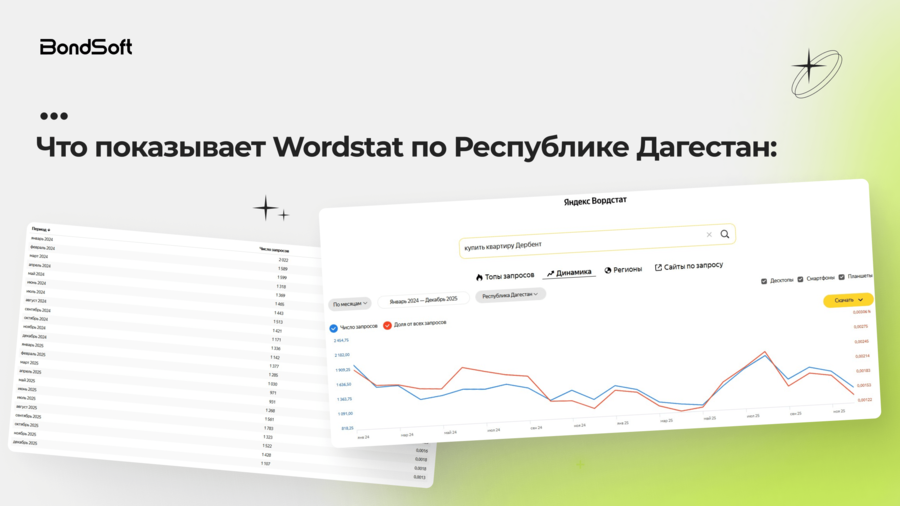 Анализ данных Яндекс Wordstat за 2024–2025 годы показал, что спрос на покупку жилья в Дагестане сохраняется в течение всего года. Ежемесячно фиксируется от 900 до 2 000 поисковых запросов, связанных с покупкой недвижимости.