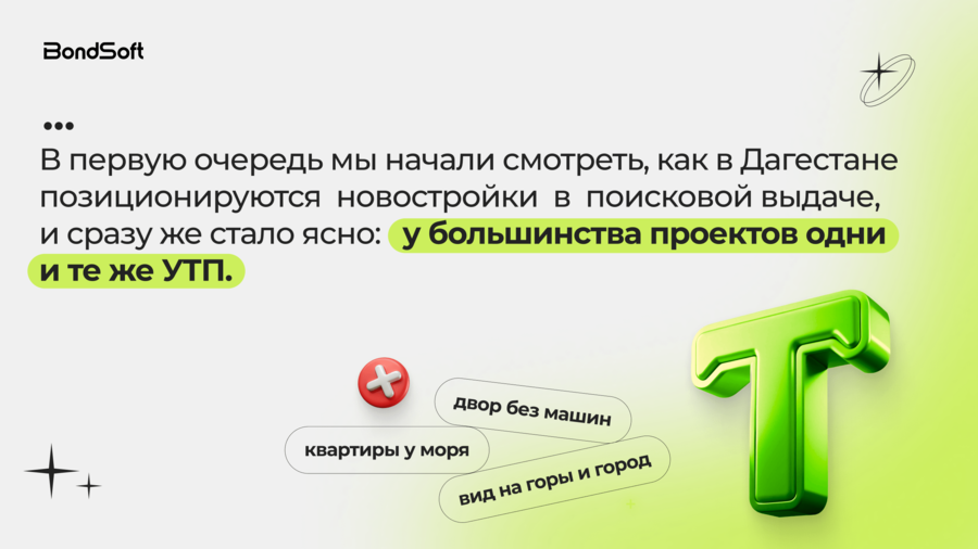 На этом фоне застройщики сталкиваются с типовой проблемой: большинство предложений в поисковой выдаче выглядят одинаково, а стандартные УТП («вид на море», «ипотека», «панорамные окна») перестают работать как фактор выбора. В таких условиях результат рекламы зависит не от формулировок, а от системной настройки и работы с данными.