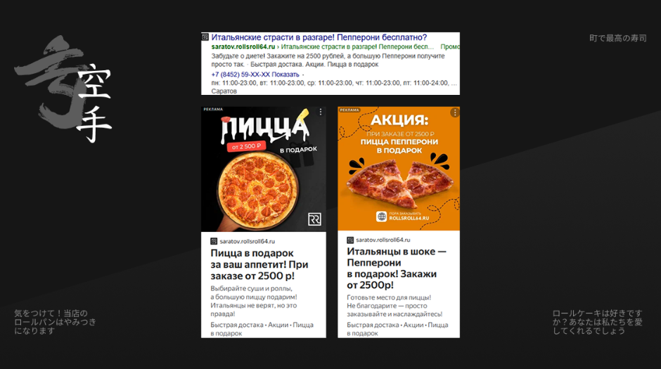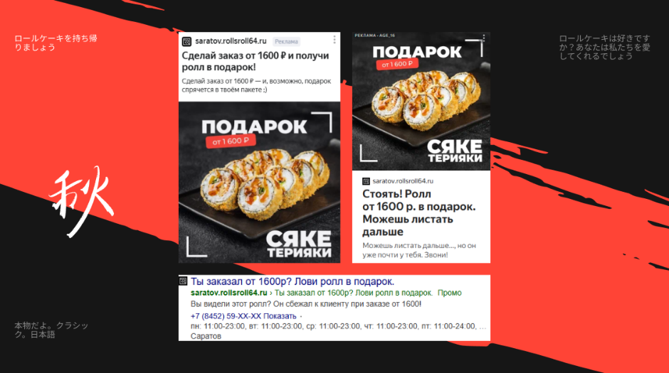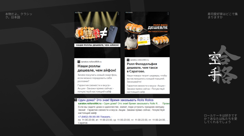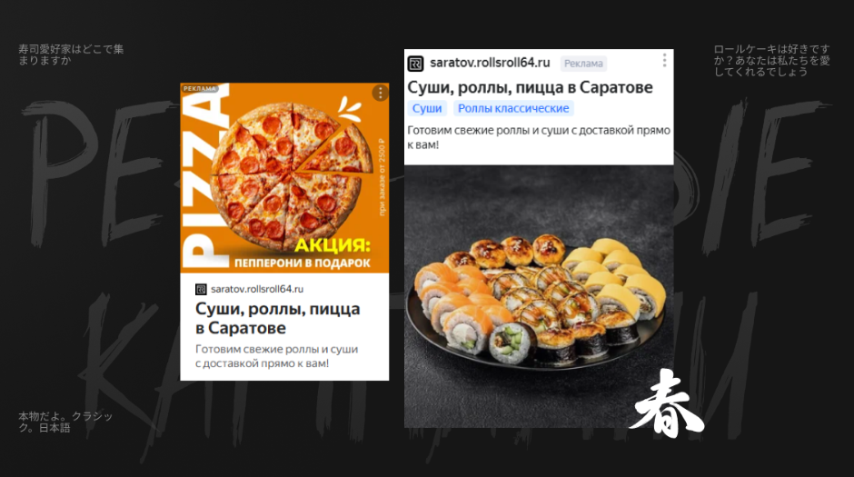 Товары. Здесь клиент упростил нам задачу: качество продукта на фото полностью соответствовало реальности. Нам предоставили профессиональную фотосъемку роллов, пиццы и суши. Это критично для доставки еды: когда картинка в объявлении совпадает с тем, что приезжает курьером, конверсия растёт, а отток клиентов после первого заказа минимален.?
