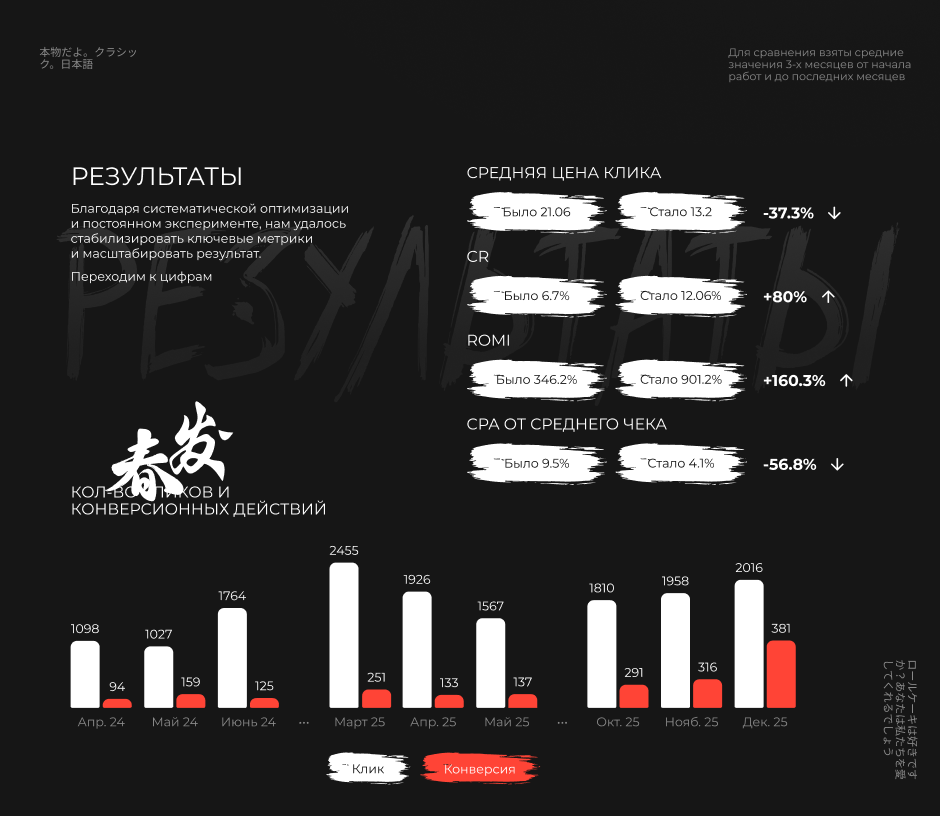 Позиционирование. Здесь пришлось поработать. Бренд тяготеет к минимализму, который плохо работает в контекстной рекламе и не пробивает баннерную слепоту (особенно в РСЯ). Мы нашли компромисс: для холодной аудитории и охватных кампаний использовали яркие, эмоциональные креативы, а для ретаргетинга и теплого трафика — более сдержанные визуалы в духе фирменного стиля. Так удалось совместить узнаваемость бренда с эффективностью привлечения.