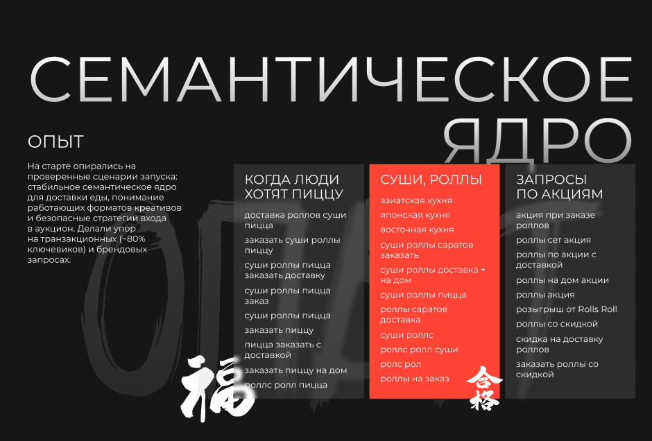 Опыт. На старте опирались на проверенные сценарии запуска: стабильное семантическое ядро для доставки еды, понимание работающих форматов креативов и безопасные стратегии входа в аукцион.? Делали упор на транзакционных (~80% ключевиков) и брендовых запросах.