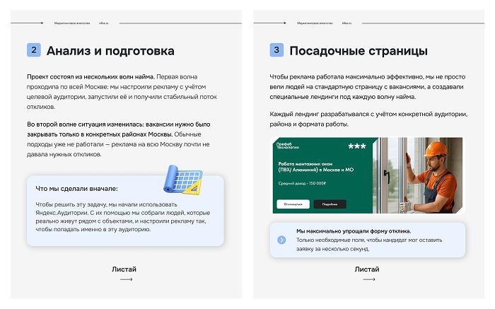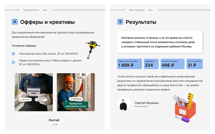 «Важно не просто запустить рекламу, а выстроить её правильно — от точной аудитории до креативов и посадочных страниц. Если хотите получать такие же стабильные и качественные результаты по привлечению монтажников окон или специалистов других профессий, обращайтесь в наше агентство — мы умеем превращать рекламу в реальные заявки»