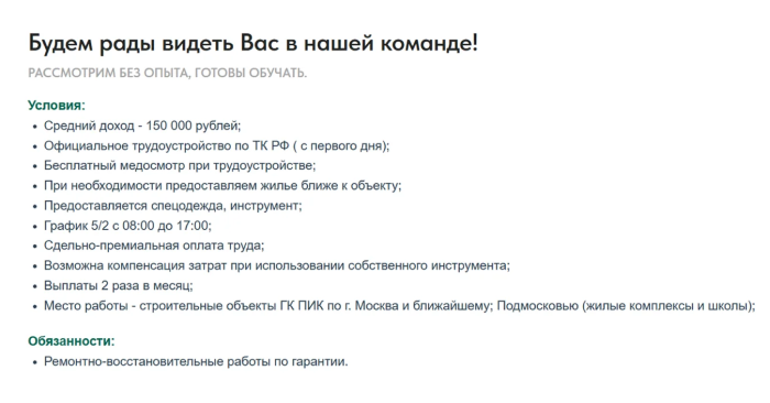 В текстах объявлений мы делали упор на чёткость и конкретику. Кандидат сразу видел, какая профессия требуется, нужно ли иметь опыт, и какой уровень заработка. Такой подход помогал человеку быстро понять, подходит ли ему эта работа, и принять решение об отклике.