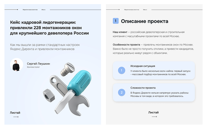 «Привет! Меня зовут Сергей, я таргетолог. В нашем агентстве мы постоянно работаем с проектами в сфере HR и промышленности. В этом кейсе расскажу, как мы вышли за рамки стандартных настроек Яндекс.Директа и смогли привлечь монтажников из нужных районов Москвы, когда прямые инструменты просто не работали»