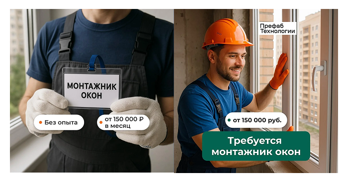 Для привлечения монтажников мы сделали упор на визуальное оформление объявлений. В качестве креативов использовали фотографии монтажников окон на работе. Они помогали сразу показать, о какой профессии идёт речь, и делали рекламу наглядной и понятной для кандидатов.