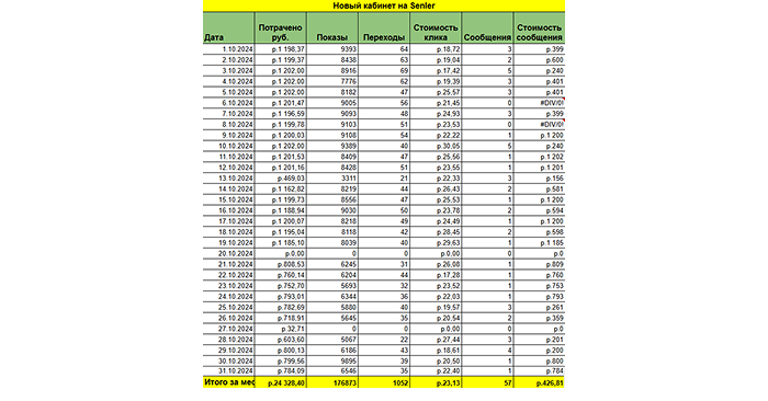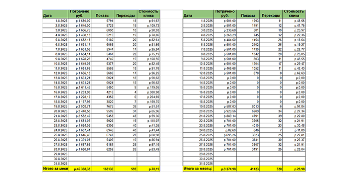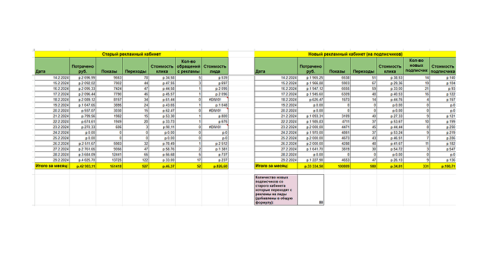 Мы вели проект через ежедневные отчёты по кабинетам и направлениям: отдельно фиксировали расходы, показы, переходы, стоимость клика и итоговые действия (обращения или подписки).