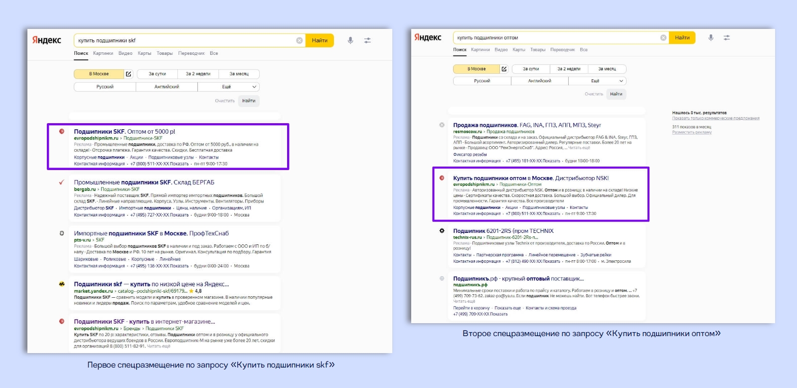 По итогу была получена карта конкурентов с их преимуществами, сводная таблица с офферами, рекламными объявлениями (именно на их основе мы составляли объявления рекламы подшипников в Яндексе), источники трафика конкурентов и их объёмы, рекламные бюджеты и многое другое.