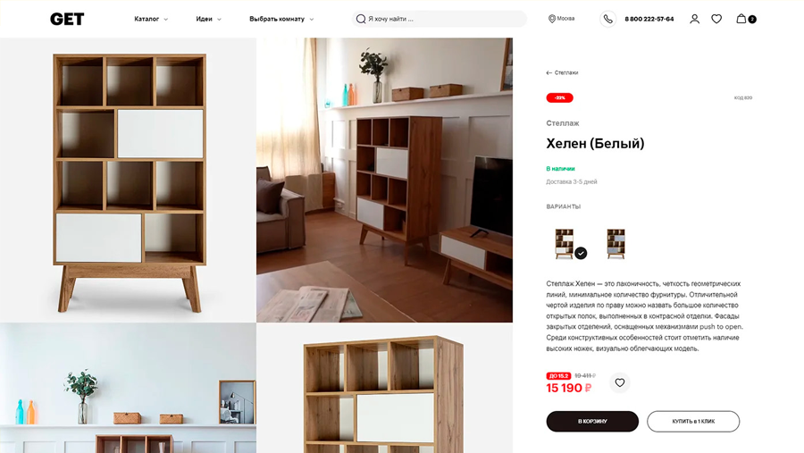 Сегодняшние клиенты ищут вдохновение, просматривая сайты и приложения, такие как Pinterest и Telegram, чтобы собрать со вкусом подобранные примеры дизайна интерьера. Мы предложили использовать курируемый контент, интерьеры с продуктами, которые можно приобрести на get.ru, организовав возможность покупки по изображению. Сама по себе идея не нова, но особенностью ее реализации стал приоритет на фото и видео контенте, по сравнению с текстовым. Вместе с тем, раздел «Идеи», снабжен возможностью организации структуры Cluster-Pillar, когда одна публикация объединяет одну из больших тем ссылаясь на набор отдельных идей интерьера, раскрывающих тему в деталях.