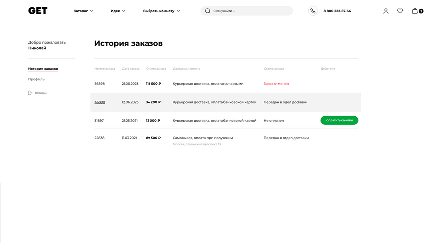 Личный кабинет пользователя построен по механизму, когда он дополняет сервисные функции. В нем можно посмотреть историю заказов, оплатить покупки, узнать состояние заказа.