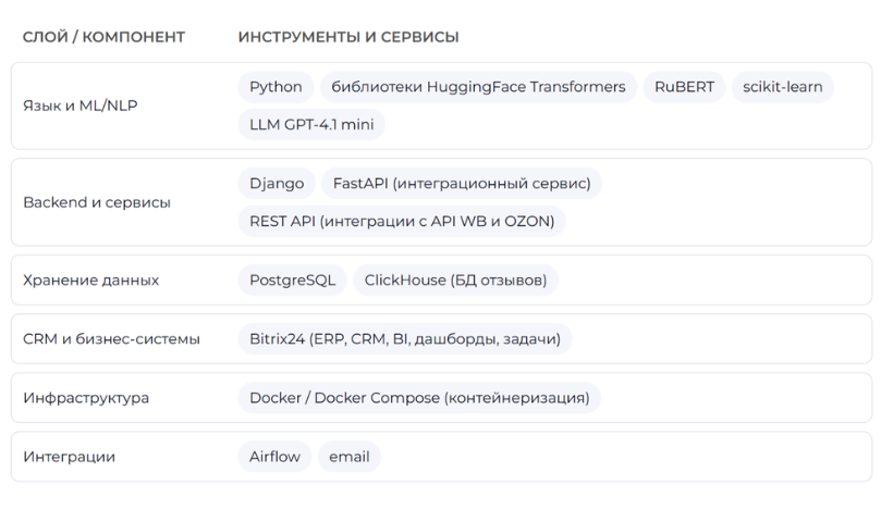Мы выстроили единый контур работы с фидбэком. Сначала объединили отзывы из Ozon и Wildberries в общий поток и развернули поверх него LLM-ядро для разметки тональности и извлечения ключевых фактов из отзывов, которые напрямую влияли на удовлетворенность сервисом.