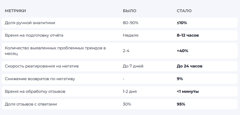 На этапе интеграции результаты анализа в режиме, близком к реальному времени, поступали в Bitrix24, где на основе размеченных данных формировались отчёты и дашборды для маркетинговых, продуктовых и операционных команд. Дополнительно были настроены сценарии оперативной работы с негативом: автоматические уведомления и постановка задач ответственным сотрудникам, контроль сроков реакции и закрытия инцидентов, что позволило сократить время обработки критичных обращений и сделать процесс более управляемым и прозрачным.
