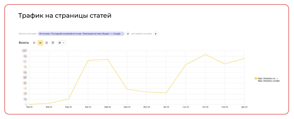 Сейчас мы продолжаем комплексное развитие сайта: контролируем техническое состояние, анализируем позиции и поведение пользователей, расширяем каталог и семантику, публикуем новые статьи и отслеживаем видимость в нейросетях.