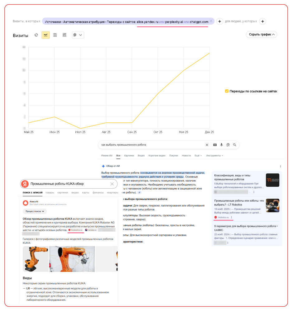 Результат — стабильный рост визитов из нейросетей (Алиса, ChatGPT, Perplexity) и усиление присутствия бренда в AI-ответах по ключевым запросам.