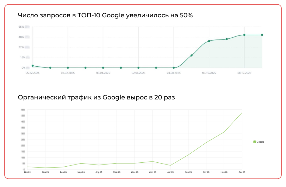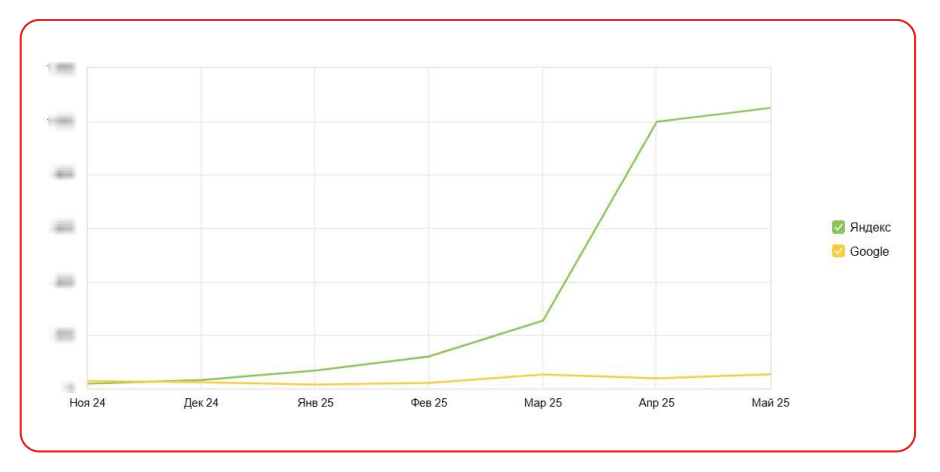 Параллельно улучшаем UX — навигацию, фильтры, карточки и структуру страниц, чтобы пользователям было проще находить нужные решения. Это обеспечивает стабильный рост органического трафика и повышает конверсию в обращения.