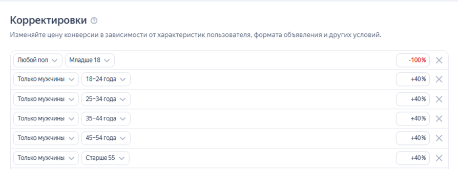 Корректировки по аудитории. Таким образом исключаем пустые клики и повышаем охват на наиболее конверсионную аудиторию.