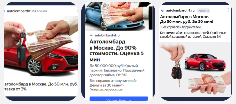 Протестировали несколько вариантов объявлений и нашли выигрышный микс. Акценты в тексте: прозрачность («без справок и поручителей»), скорость («за 30 минут», «оценка за 5 минут»), выгода («до 50 млн руб.», «до 90% стоимости», «ставка от 3%»).