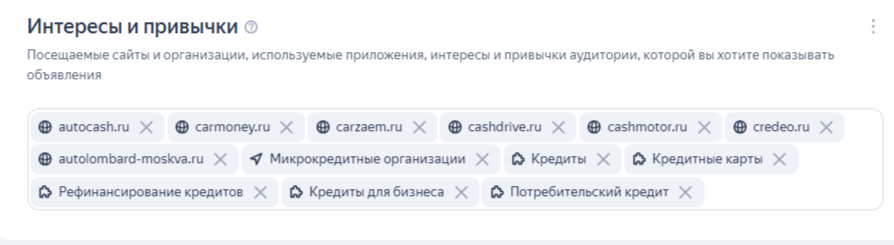 Глубокий таргетинг. Настроили показы на сайты прямых конкурентов (autocash.ru, carmoney.ru, carzaem.ru, cashdrive.ru и другие) и интересы аудитории: микрокредитные организации, кредиты, рефинансирование, кредиты для бизнеса, потребительский кредит.