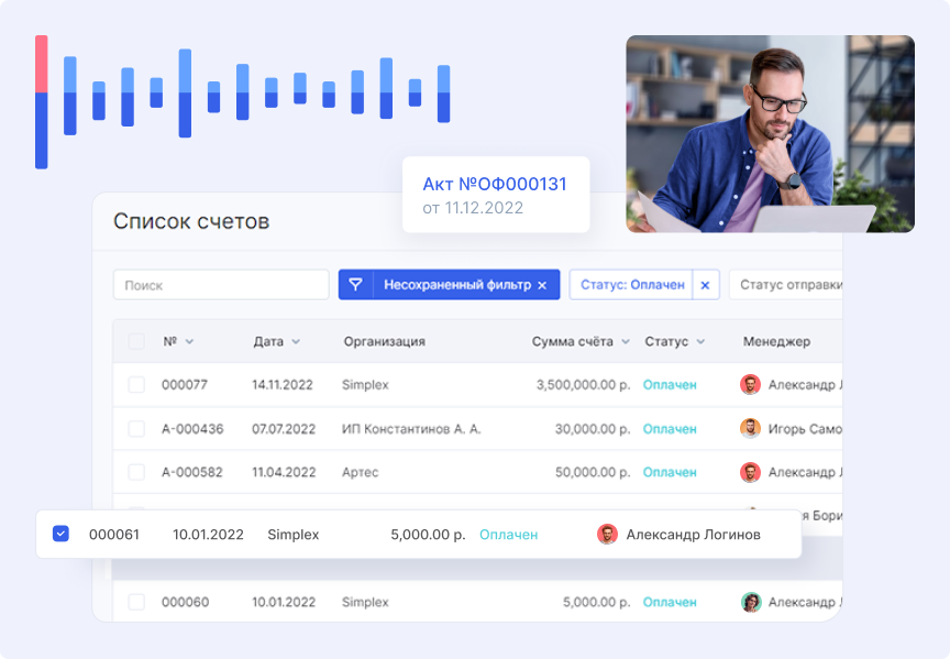 Финансовый модуль интегрировали в ежедневную работу. После завершения этапов проекта руководитель формирует счета прямо из сделки — система автоматически подтягивает данные контрагента и стоимость услуг.