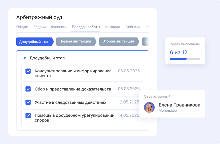 Для типовых процедур разработали шаблоны проектов. В них заранее заданы стадии и перечни задач. Например, в проектах по банкротству фиксируются этапы:
