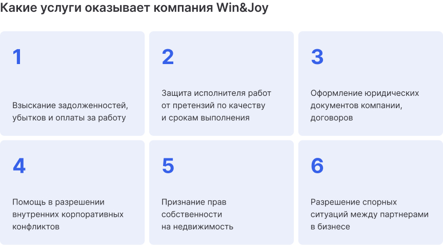 Юридическая компания Win&Joy ведет комплексные проекты: арбитражные споры, банкротства, корпоративные конфликты и судебные разбирательства. В работе одновременно может находиться до 30 дел.