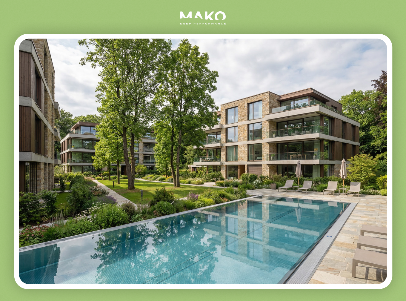 Компания владеет элитным загородным ЖК в предместьях крупного и популярного российского города. На большой территории разбили цветущий сад и поле для гольфа, построили красивые здания в 3-5 этажей, спортивные площадки, школу, магазины, ресторан и бассейны с шикарными пляжами.