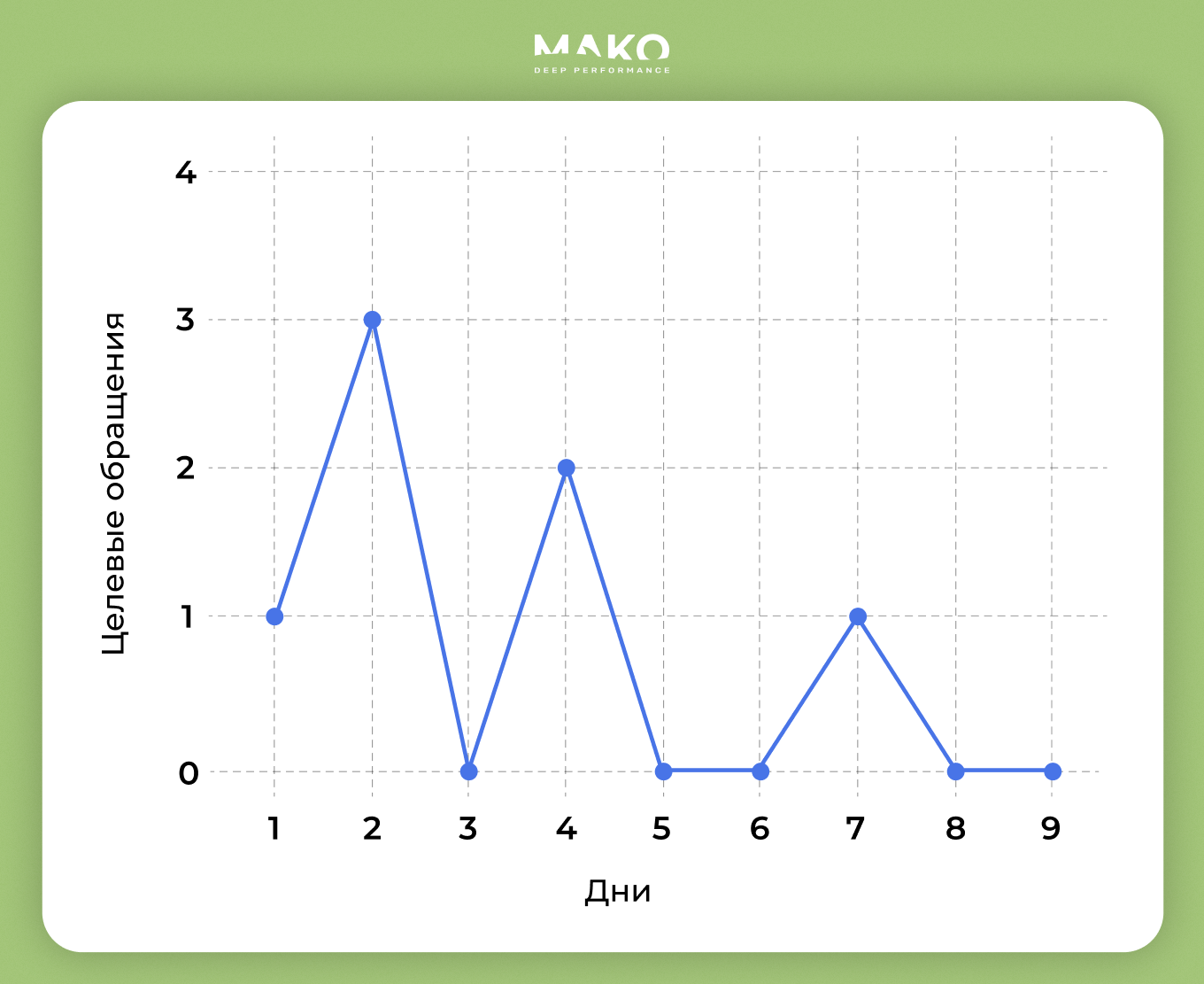 Как поступить в такой ситуации? Клиенту нельзя сказать «нет». И «да» мы тоже не можем сказать, потому что понимаем, что реально добавлять только по 10-30% в месяц. Когда рекламодатель ставит такие задачи, то вынуждает подрядчика идти на крайние меры, которые, обычно, дают плохой результат. Пришлось сыграть ва-банк, чтобы резко повысить обращения…