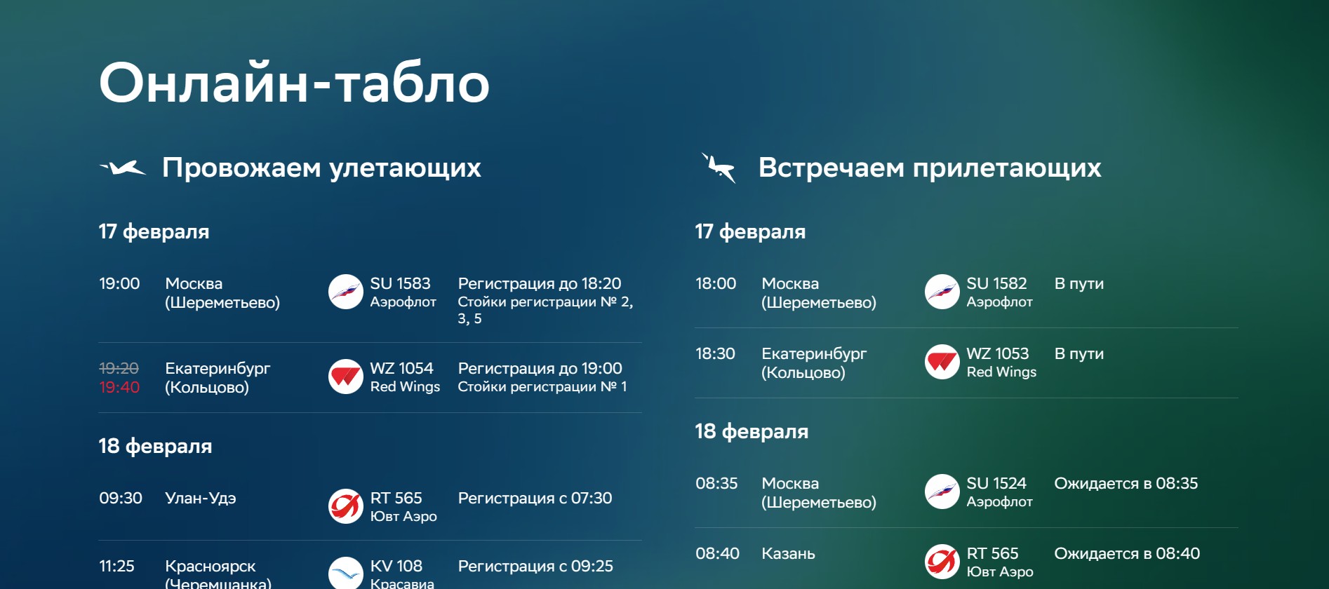 онлайн-табло мгновенного информирования клиентов о статусах рейса (прилет, вылет, задержки и текущий статус);