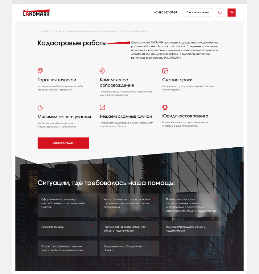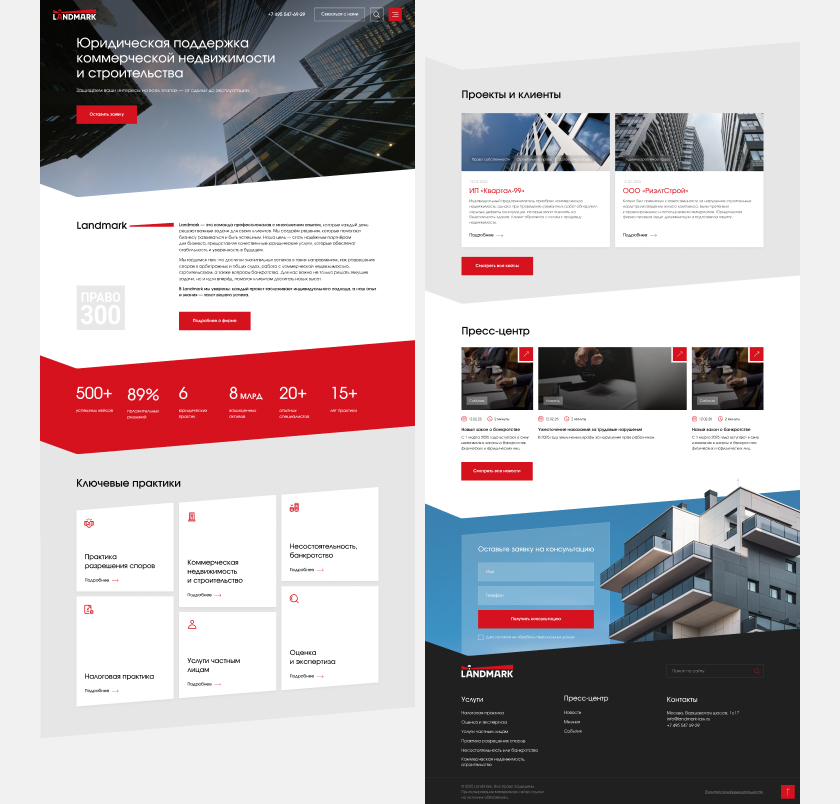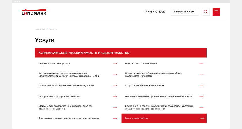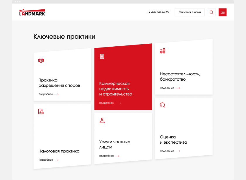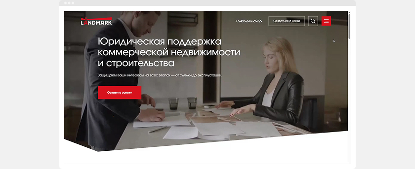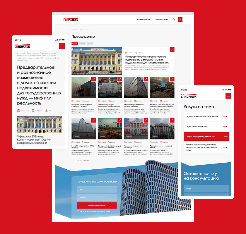 Landmark работает с крупными игроками рынка недвижимости. Старый сайт фирмы стал «узким горлышком»: он плохо ранжировался в поиске и визуально не соответствовал уровню сделок, которые сопровождает компания. B2B-клиенту было сложно быстро считать специализацию фирмы и найти нужную услугу в запутанной структуре.