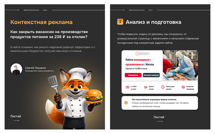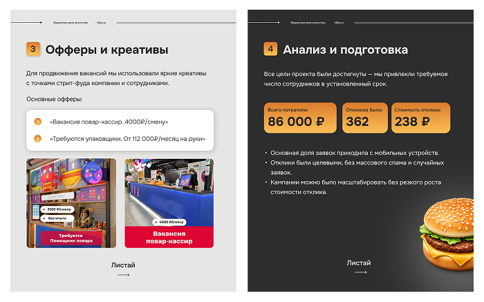 В объявлениях мы делали ставку на простоту и конкретику. Кандидат сразу видел, какая позиция открыта, нужен ли опыт и какая оплата. Такой подход помогал человеку быстро понять, подходит ли ему эта работа, и принять решение об отклике. Благодаря прямой подаче меньше случайных заявок, а отклики приходили от реально мотивированных и готовых к работе людей.