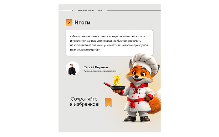 «Мы отслеживали не клики, а конкретные отправки форм и источники заявок. Это позволило быстро отключать неэффективные связки и усиливать те, которые приводили реальных кандидатов. Мы уверены, что наш опыт и профессионализм помогут вам достичь подобных результатов. Свяжитесь с нами сегодня, чтобы обсудить ваши маркетинговые цели и разработать эффективную стратегию для вашего бизнеса» - Сергей Леушкин - Руководитель отдела разработки