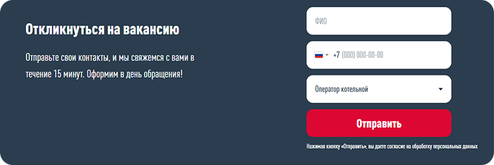 Только необходимые поля, чтобы кандидат мог оставить заявку за несколько секунд. Никаких лишних вопросов