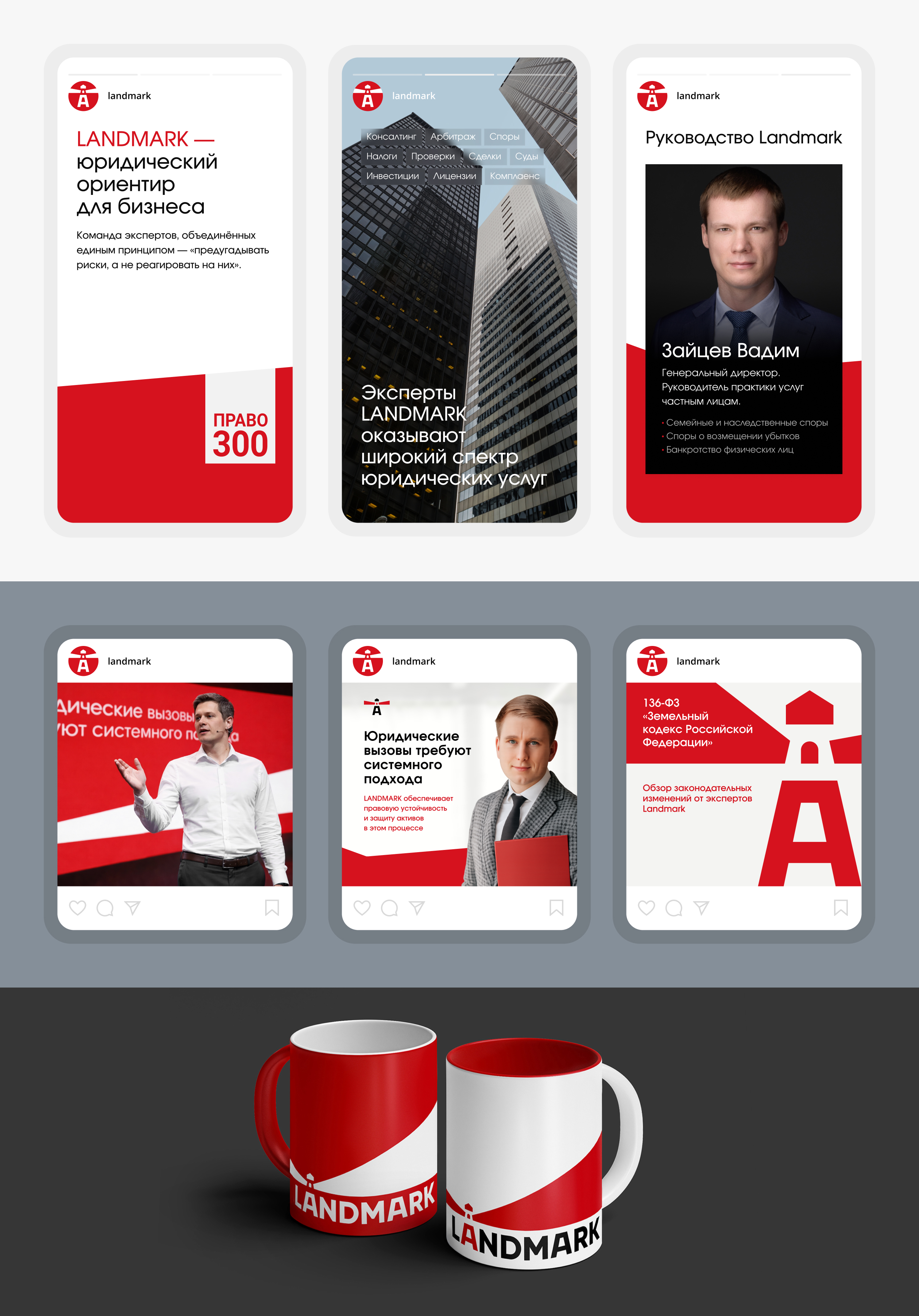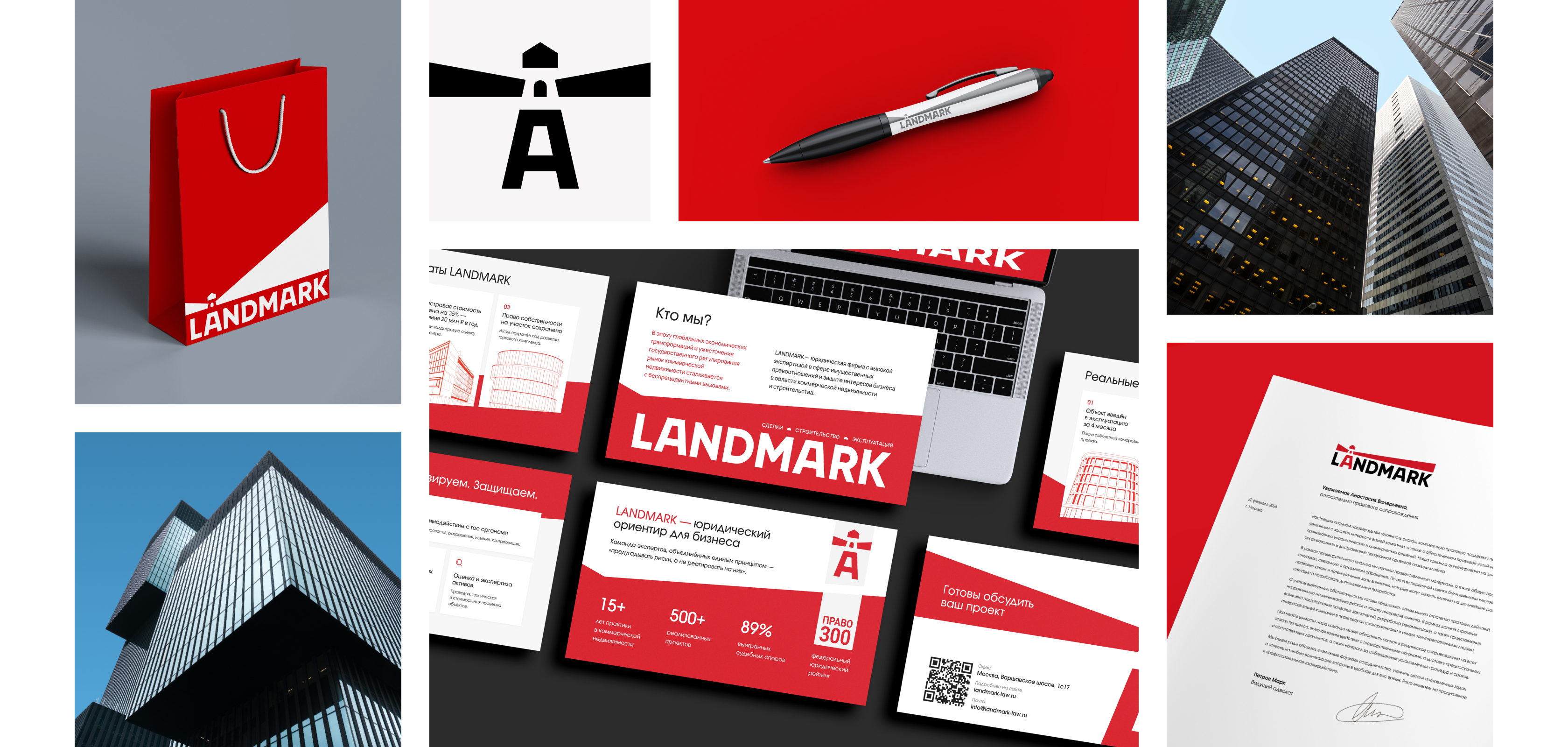 Перед нами стояла задача создать современный и профессиональный фирменный стиль, который бы выделял Landmark на фоне рынка. При этом было ключевое условие — сохранить преемственность символа маяка (это их зарегистрированный товарный знак), но полностью обновить его, уйдя от любых типичных юридических клише (никаких молотков, весов, щитов).