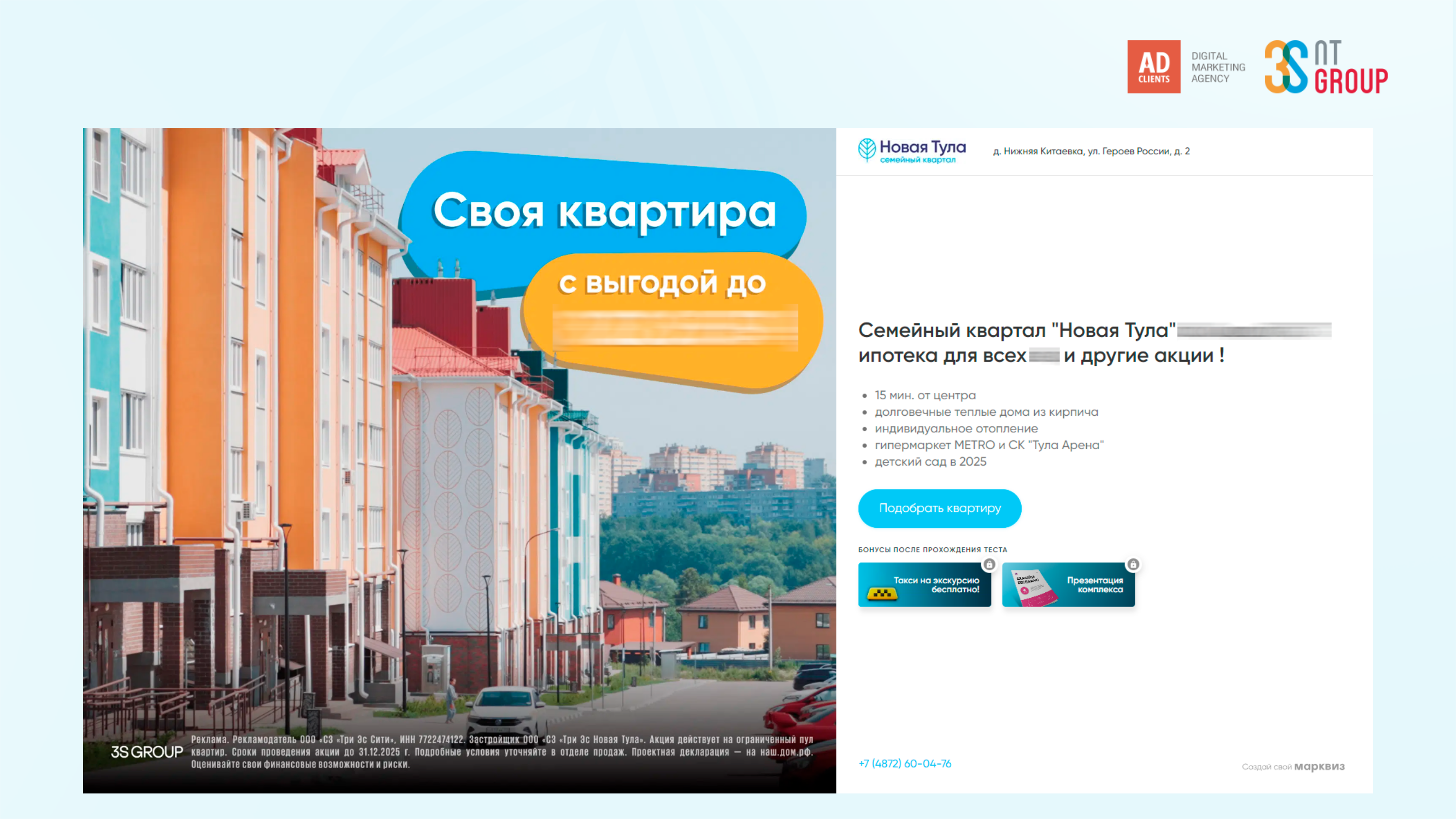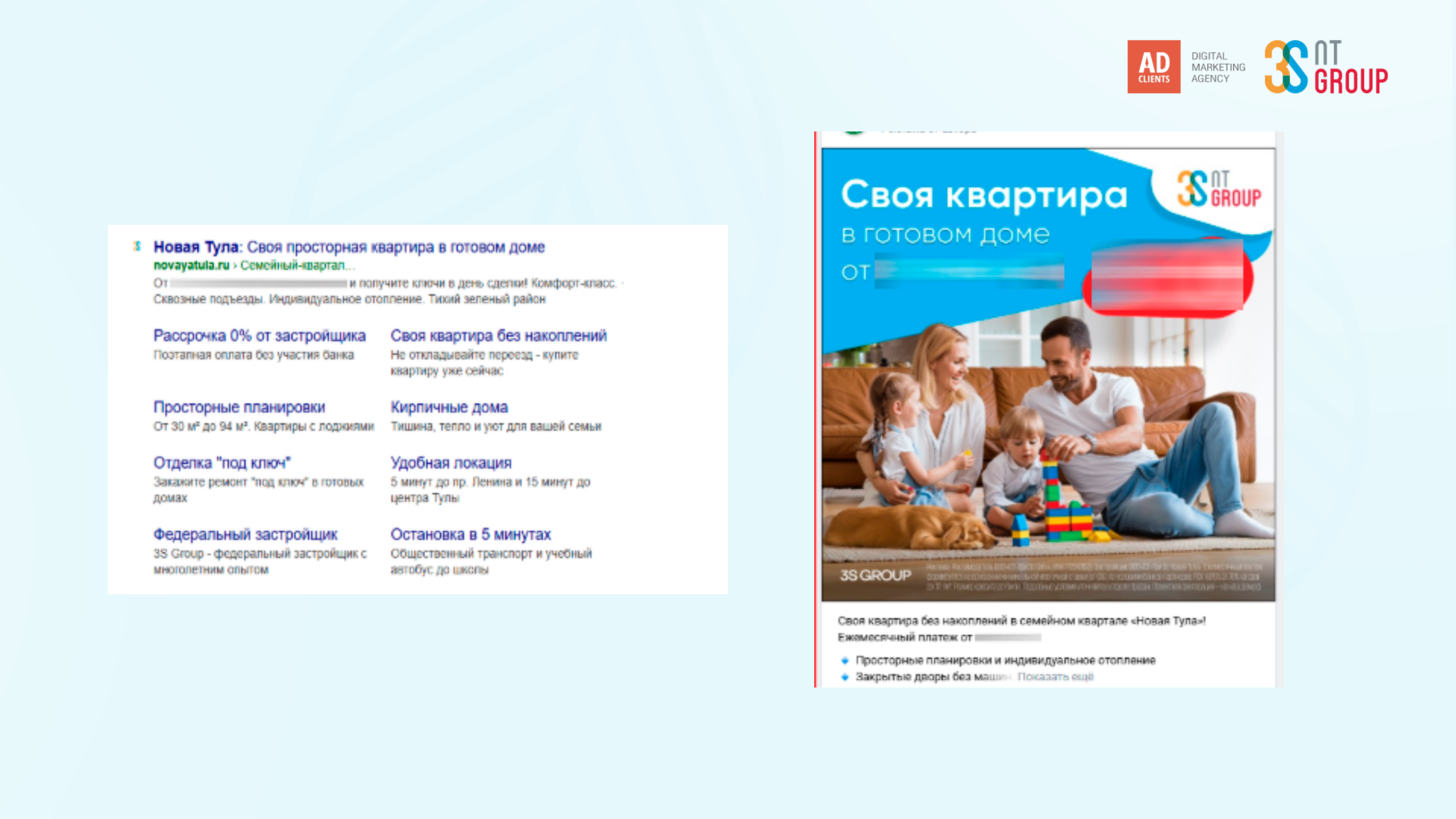 — Кампания «Коммерция + Инфо»: Перехват пользователей в стадии активного поиска. Использовали детальную семантику по кластерам: «новостройки в привокзальном районе», «купить квартиру в Туле», «ипотека на новостройку», «планировки 2-комнатных квартир».