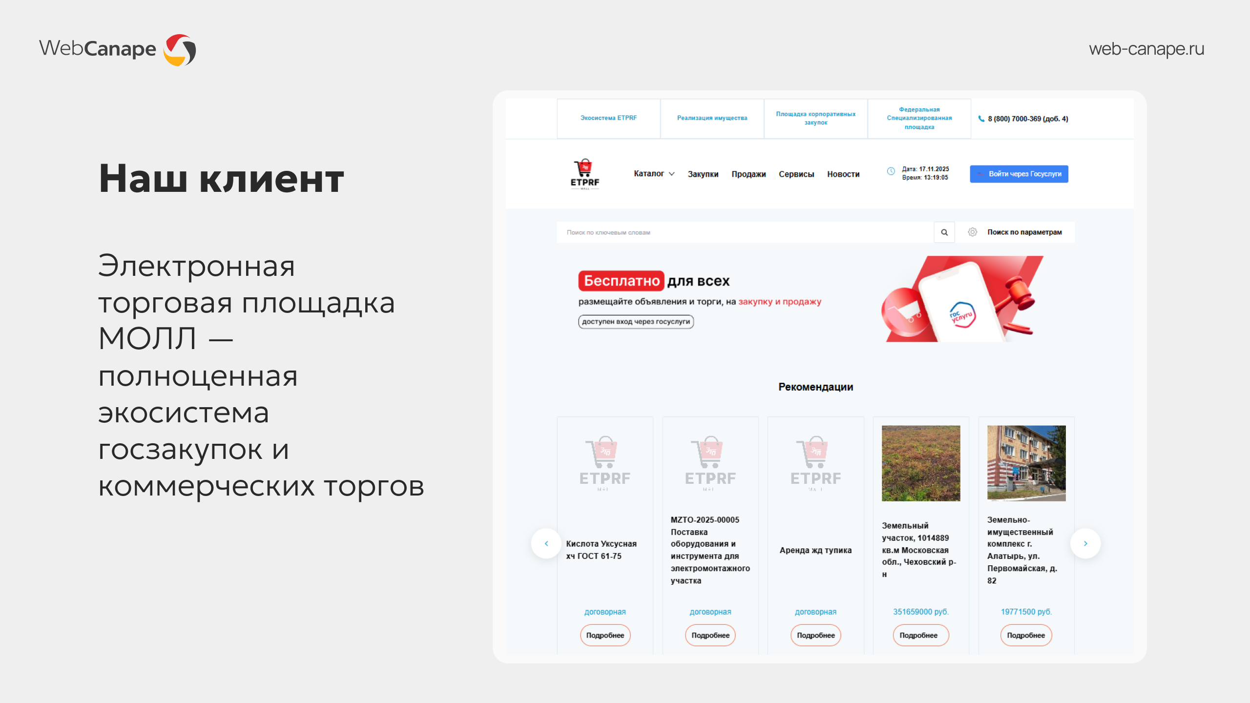 Перед нами стояла задача, при решении которой нельзя было допустить даже малейших ошибок. Ведь это не просто сайт, а полноценная экосистема госзакупок и коммерческих торгов — Федеральная специализированная электронная торговая площадка, утвержденная распоряжением Правительства РФ от 23 ноября 2022 г. N 3574-р для проведения закупок в рамках № 44-ФЗ о «Контрактной системе» и № 223-ФЗ о «Закупках отдельных юрлиц». Здесь компании заключают контракты на миллионы рублей, проводят тендеры и аукционы, работают с финансовым обеспечением заявок.