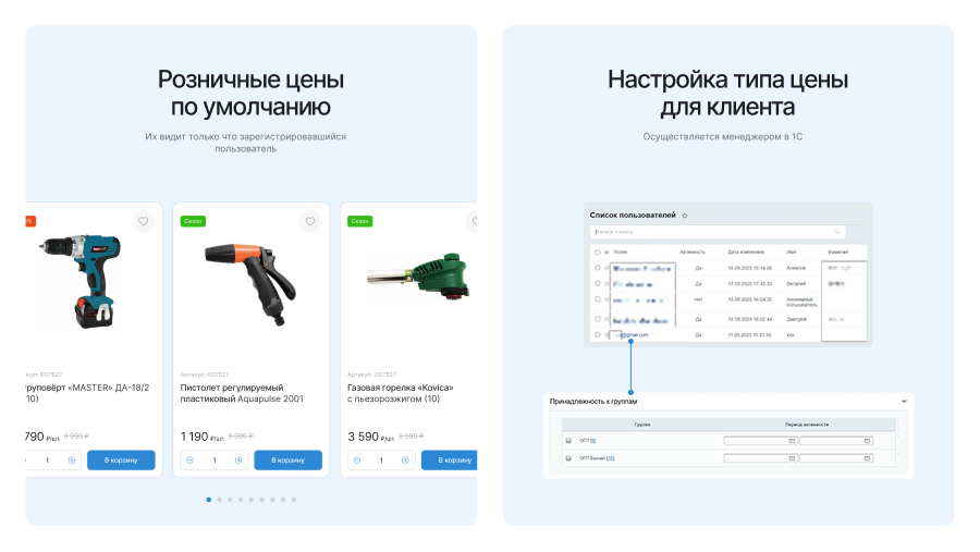 Личный кабинет стал рабочим инструментом для B2B-аудитории: хранит историю заказов, реквизиты и адреса, подтягивает индивидуальные цены из 1С. Клиенту не нужно каждый раз вводить данные, а менеджеры видят актуальные заявки и могут быстро выставить счет.