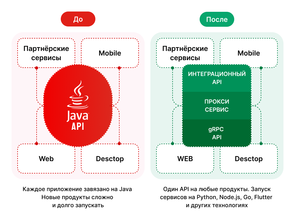 Фактически мы разделили систему на две части: стабильное ядро, которое продолжает работать без изменений, и внешний слой, через который развивается вся продуктовая экосистема. Такой подход позволил не трогать критичную бизнес-логику и одновременно снять технологические ограничения.