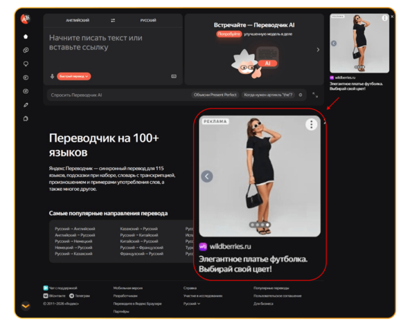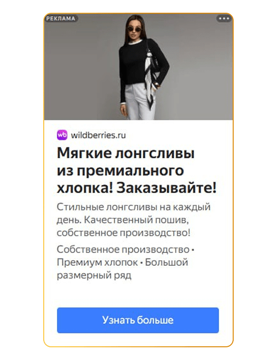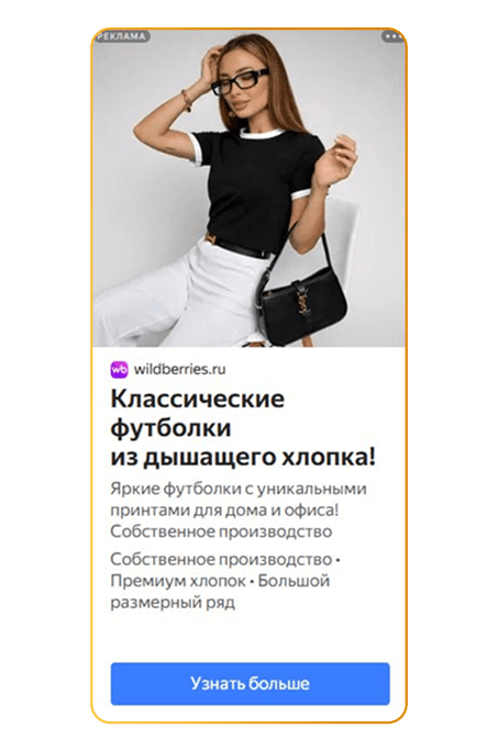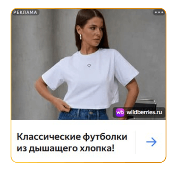 Нативный формат для поиска.Объявления подтягивали фотографию товара автоматически, без лишних рамок и логотипов. Это имитировало органическую выдачу Wildberries — пользователь видел вещь в знакомом интерфейсе, что повышало доверие и снижало «баннерную слепоту».