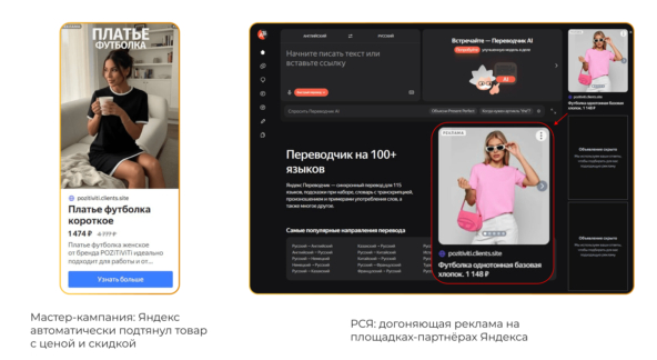 На весь ассортимент мастер-кампания работала иначе: Яндекс автоматически подбирал товар из каталога под запрос пользователя. Мы настроили фильтрацию нерелевантных запросов (чтобы не показывать платье-футболку по запросу «вечернее платье») и контролировали, чтобы «слабые» товары не перетягивали бюджет у локомотивов.