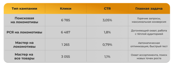 Такое разделение позволило нам гибко управлять бюджетом, быстро находить рабочие связки и масштабировать то, что даёт результат