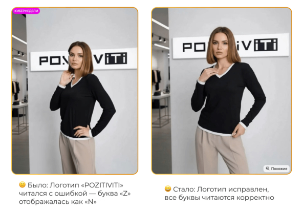 Во-первых, обратили внимание на видео: в некоторых карточках было заметно, что ролик сгенерирован нейросетью — световые переходы выглядели неестественно, а в названии бренда буква «Z» отображалась как «N». Мы посоветовали обрезать проблемные фрагменты и привести видео к единому стилю.
