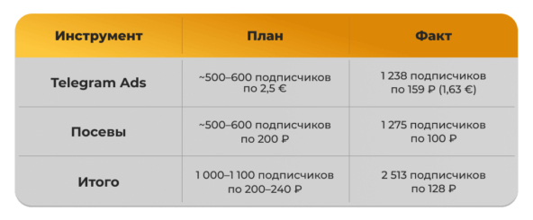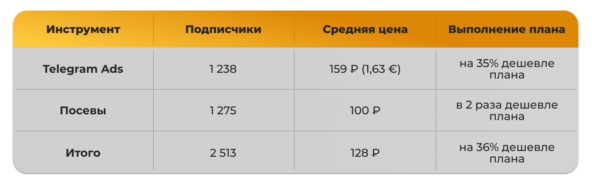 В результате за 5 месяцев привлекли 2 513 подписчиков по средней цене 128 ?, что на 36% дешевле плана.