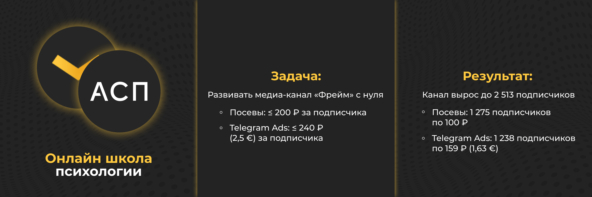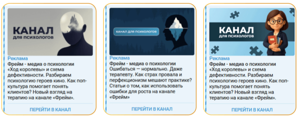 Почему сработало: мы сделали ставку на нативные посты. Вместо откровенной рекламы писали тексты в стиле «личная рекомендация» от автора канала. Такие объявления вызывают больше доверия: люди охотнее подписываются на полезный контент, чем на прямые продажи. Для практикующих психологов делали акцент на экспертизу и квалификацию, для широкой аудитории — на разборы фильмов и инсайты «без розовых очков».
