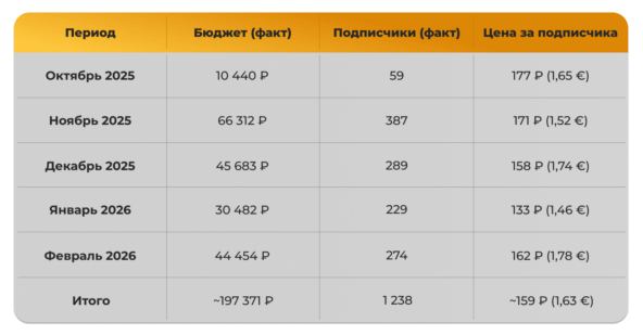 К февралю 2026 на 3-й неделе цена подписчика временно выросла до 3?3,5 € — креативы снизили эффективность. Мы оперативно запустили новые баннеры и текстовые подачи, протестировали акцент на «сообщество» вместо «экспертиза» и к концу месяца вернули цену к норме. Средняя стоимость за февраль составила 1,78 €.