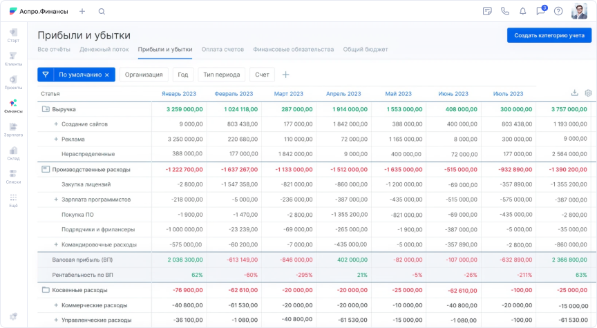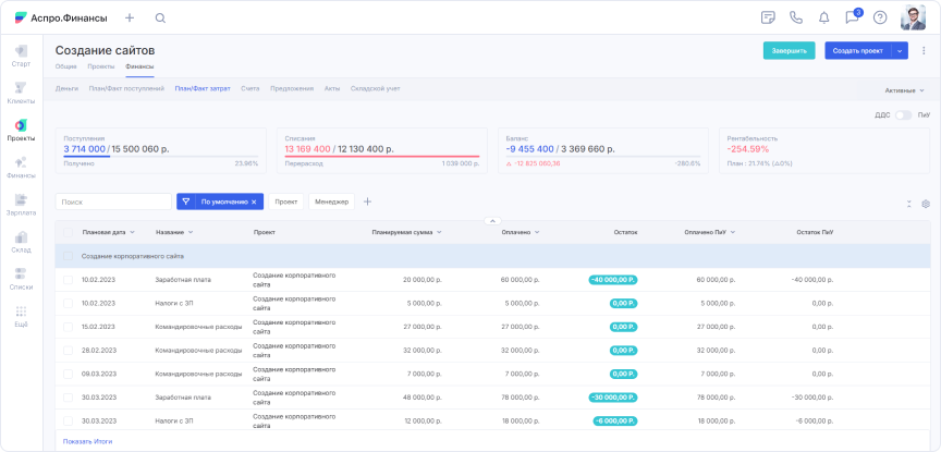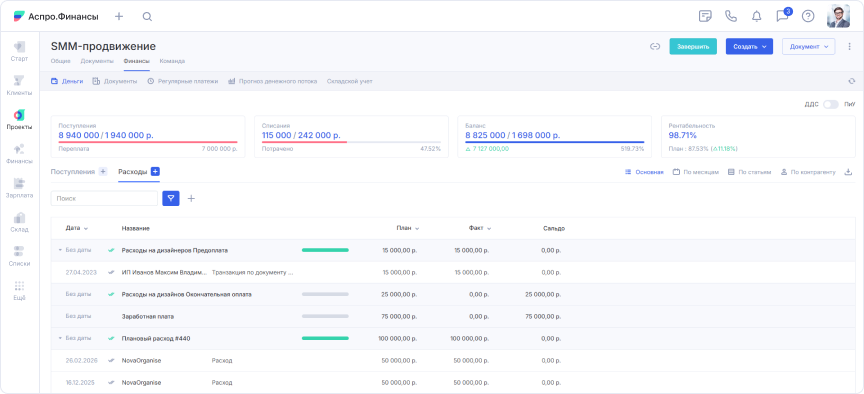 Специфика агентства — проектная работа. Денежные потоки нужно учитывать по клиентам и кампаниям, важна аналитика по юрлицам, направлениям и контрагентам. Павел изучил десятки сервисов финучета и остановился на Аспро.Финансы.