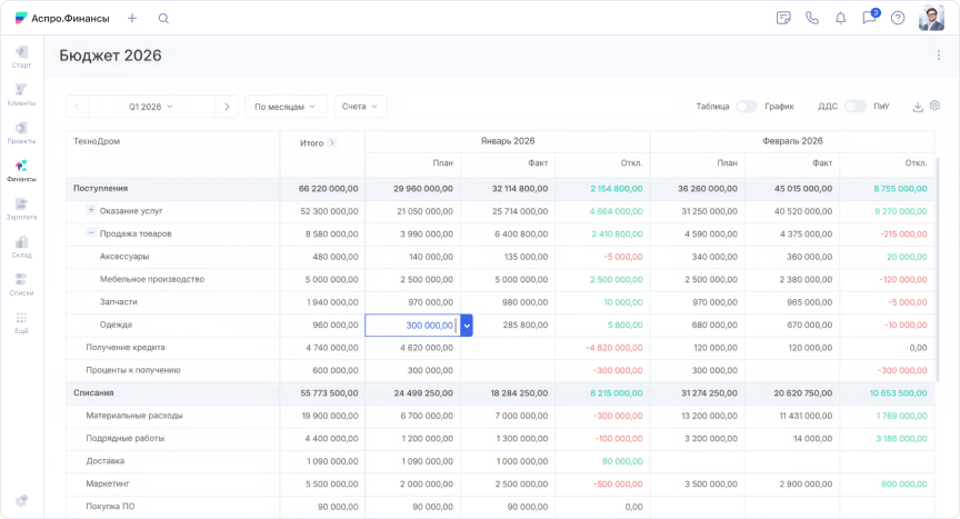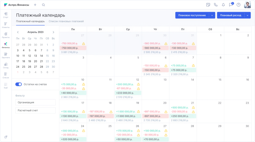 В Аспро.Финансы плановые платежи создаются за пару кликов, бухгалтер сразу видит предстоящие списания, а после оплаты система отмечает операцию как выполненную.